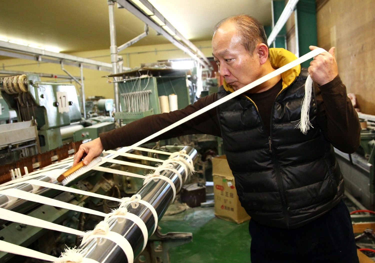 こうして培ってきた技術をベースに、木糸の可能性の拡大に取り組んできた。木糸は伸度がないので「縦糸に綿、横糸に木糸を使った」と阿部社長。さらに和紙原料の配合率を調整したり、木糸に綿糸を巻いて強度アップをはかったりと改良も重ねたという。