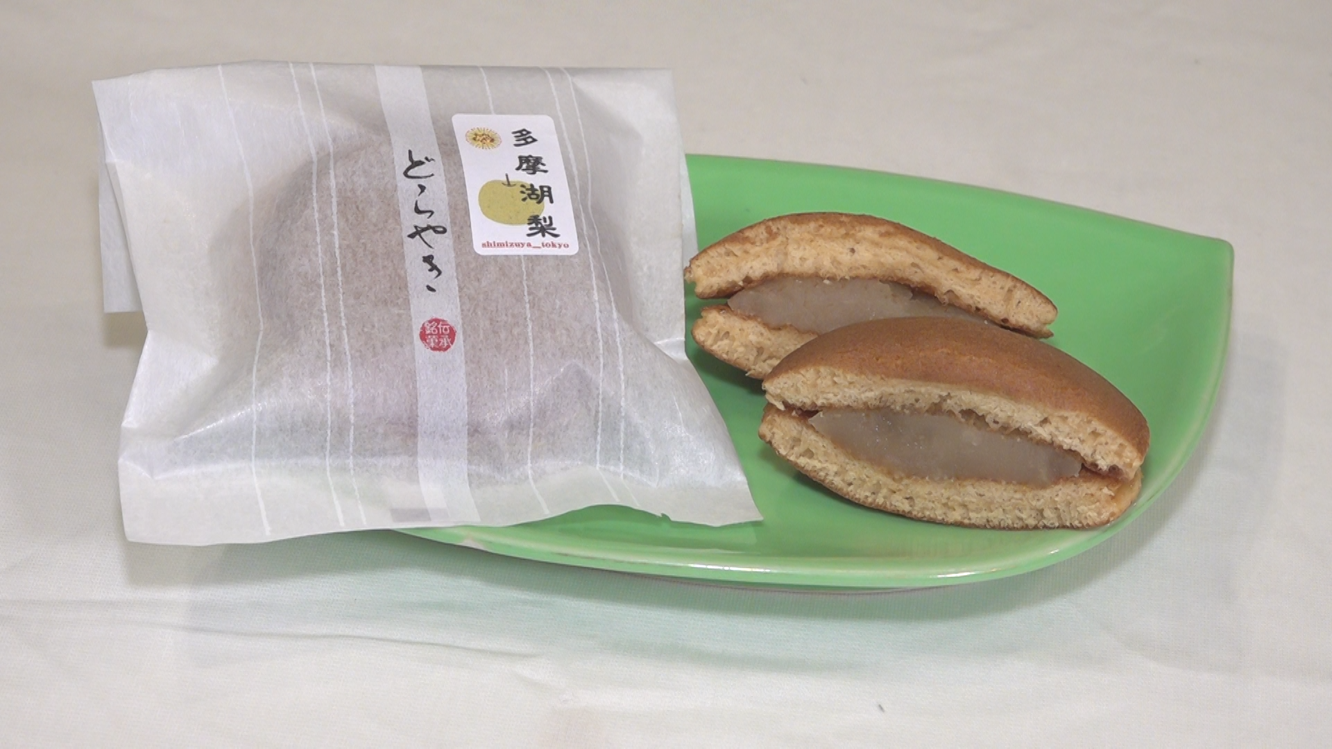 店主の松本國秋さんのイチオシは、梨の産出額が東京都内第2位である東村山市のブランド梨「多摩湖梨」を贅沢に使った「どらやき多摩湖梨」。これを食べた山本さん、「白あんと梨の組み合わせははじめてですが、実に爽やか」と絶賛。松本さんによれば「当初、梨の風味をうまく生かせず試行錯誤しましたが、梨を砂糖などで煮てコンフィチュールにしたところ、白あんと梨の味わいがピッタリと馴染むようになりました」とのこと。同店ではこのほか、市内のシャインマスカットを使った「羽二重餅マスカット大福」も人気だとか。気になる人はぜひ東村山散歩の折にお土産に買ってみてほしい。
