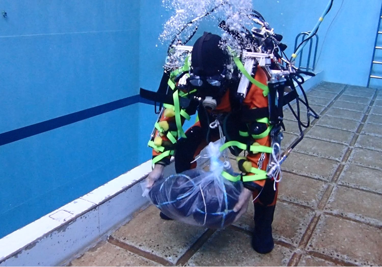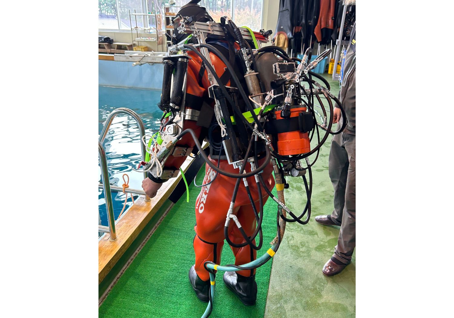 そこで椚原社長は「潜水士の負担を軽減したい」とパワースーツの開発に乗り出した。パワースーツは作業する人に装着し、重いものを持っても軽く感じる器具で、運送業や介護施設など重量のあるものを運ぶ現場で重宝されている。椚原社長 は「この陸上用のパワースーツ を水中用に転用できないか」と着想し、4年前から開発パートナーの法政大学の研究室と実証実験をすすめている。